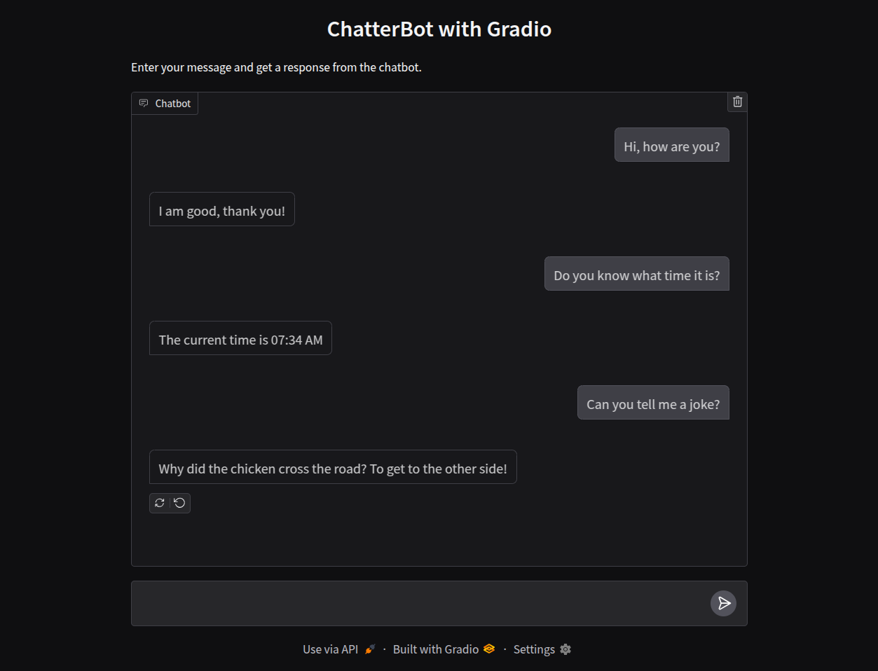 The following example code demonstrates how to initialize an instance of ChatterBot and set up a Gradio chat interface for it. While this example is intended to be simple, it is definitely worth checking out the Gradio ChatInterface documentation which covers a wide range of other components you can add to your chat interface (such as feedback for returned responses).